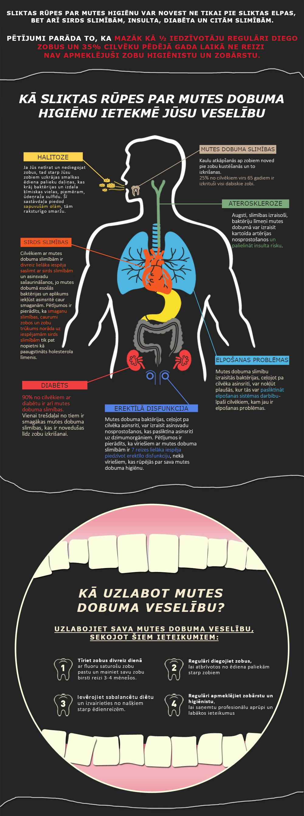 Sliktas rūpes par mutes higiēnu var novest ne tikai pie sliktas elpas, bet arī sirds slimībām, insultam, diabētam, un citām slimībām.
